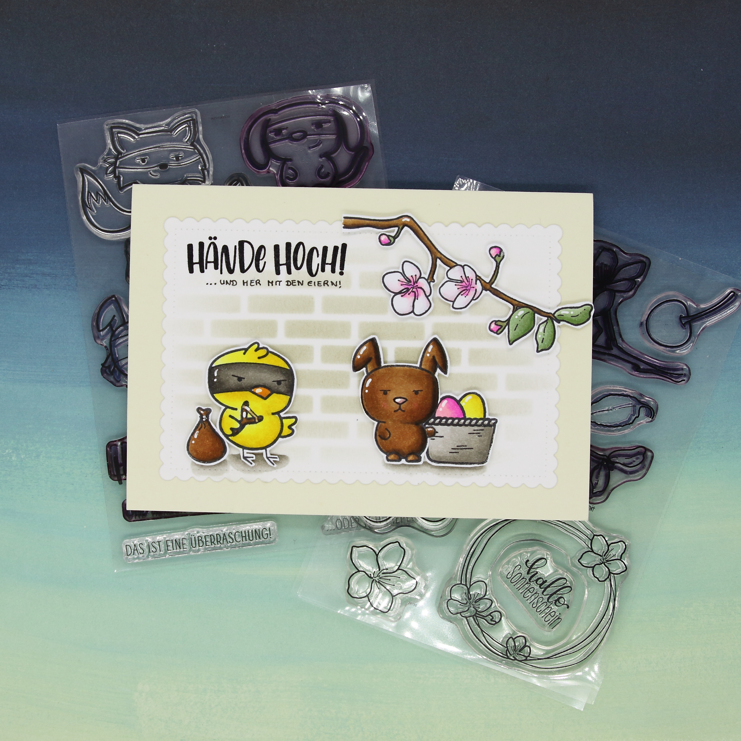 Heute zeige ich Euch eine weitere nicht so klassische Osterkarte! Der Osterhase begegnet hier offenbar einem kriminellen Küken, das ihn zur Herausgabe der Eier auffordert. Oder ist der Osterhase hier der Böse, der die "Geiseln" hält, die vom Küken nur befreit werden? Ich überlasse es Euch zu entscheiden!